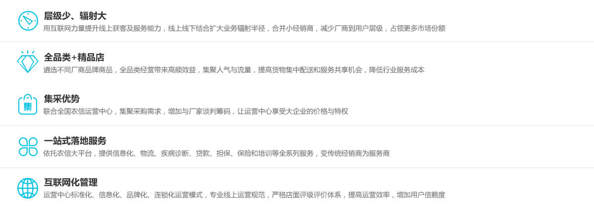 平台+服务模式下,80%的企业无需自建市场,在去中间化和转型线上化的进程下,传统经销商拥抱互联网是降低交易成本的必然选择,传统经销商何去何从?依托尊龙凯时网址大平台及运营体系,结合经销商线下运营能力,传统经销商升级为尊龙凯时网址运营中心或尊龙凯时网址小站,以农户为核心构建从管理、交易、金融到服务的全品类、一站式、连锁化的服务网络,成为农业产业互联网新中间渠道服务商。